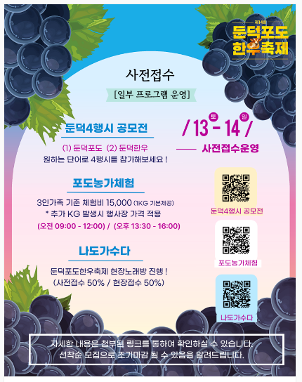 • 먹거리 및 판매: 둔덕한우구이, 포도 직거래 장터, 포도 무료 시식, 푸드트럭 등이 준비됩니다.