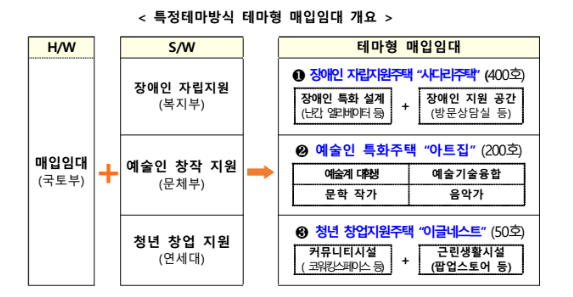 국토교통부에서는 다채로운 주거서비스 형태인 테마형 매입임대주택 시범사범을 시행하고 있다.