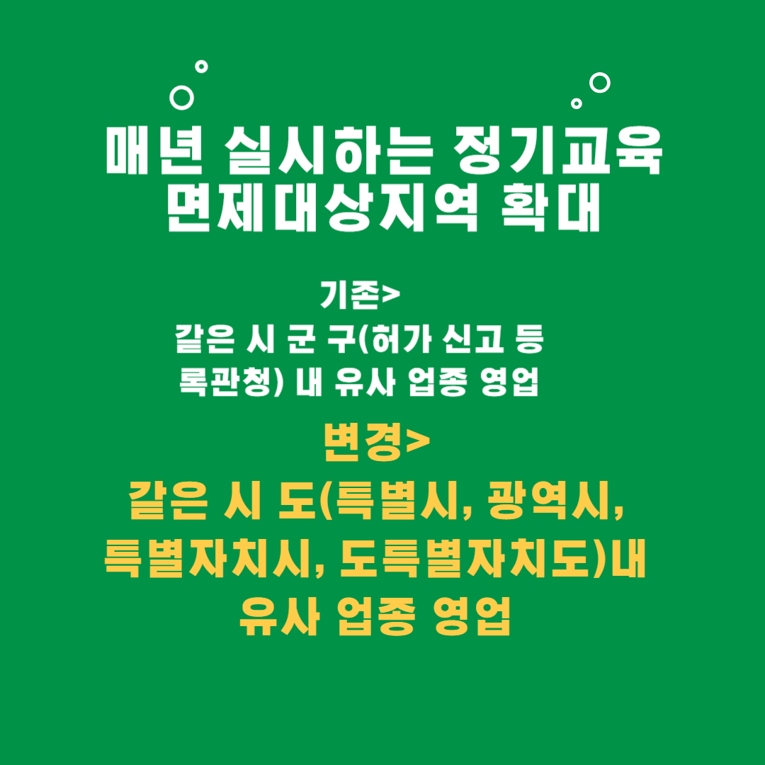 - (기존) 동일 시·군·구(허가·신고·등록 관청) 내 유사 업종 영업시 매년 정기교육 1회만 이수